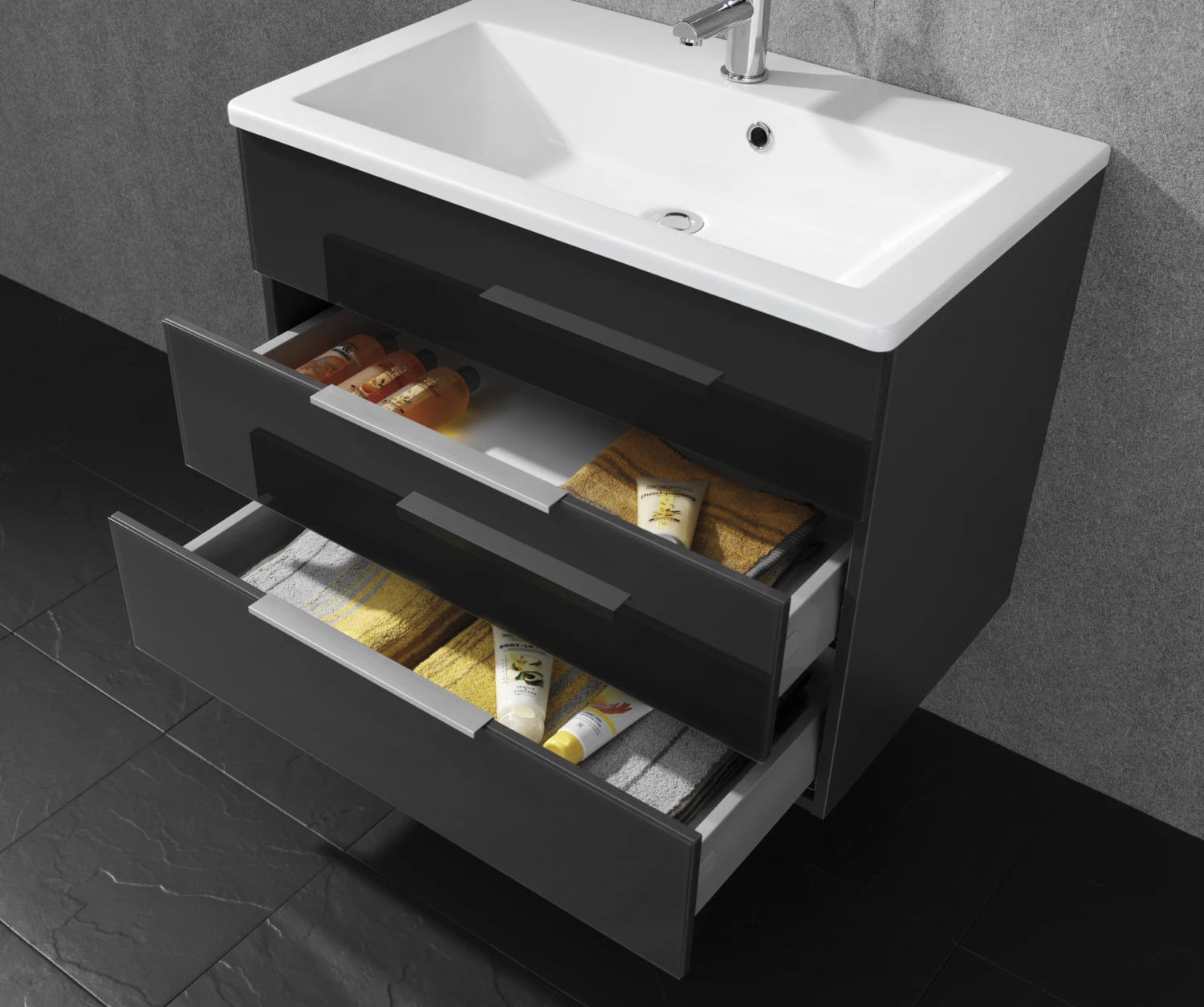 Waschbeckenunterbau KARA, Korpus und Front Anthrazit, 2 Schubladen, BxHxT ca. 794 x 587 x 488 mm