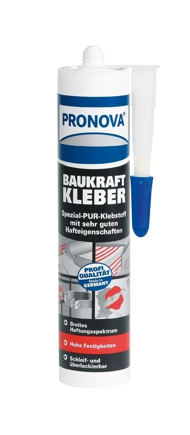 Universeller Premium PUR-Konstruktions-Klebstoff mit sehr breitem Haftungsspektrum. Der Bau Kraftkleber ist für kraftschlüssige Verklebungen von Holz, Holzwerkstoffen, Stein, Naturstein, Metall, Keramik und Kunststoffen geeignet. Zum Reparieren von ausgerissenen Scharnieren und Schrauben, Einkleben von Dübeln und Abzweigdosen ins Mauerwerk, Fixieren von Treppenstufen, Verklebungen von losen Metallverankerungen sind ebenso Anwendungsgebiete des Baukraftkleber.