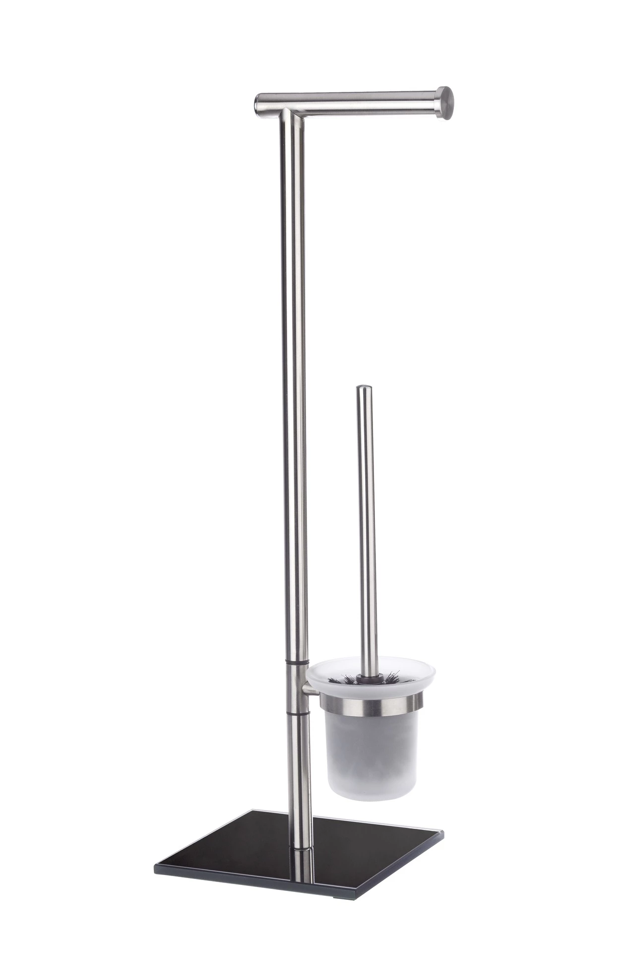 Sie ist eine komfortable 2 in 1 Kombination aus offenem Toilettenpapierrollen- und WC-Bürstenhalter, welche die Rolle und die Bürste stets dekorativ griffbereit hält. Die massive, eckige Bodenplatte aus schwarzem Sicherheitsglas sorgt für stabilen Halt.