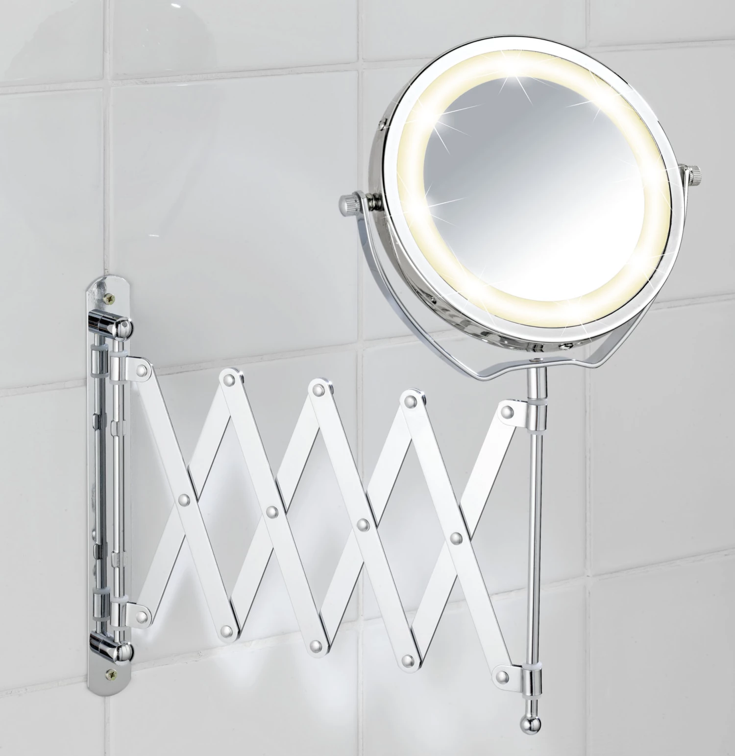 Durch seine 300% vergrößernde Spiegelfläche eignet er sich besonders für den kosmetischen Einsatz. Er erleichtert das Schminken und Rasieren. Der Wandspiegel ist nicht nur schwenk- und höhenverstellbar sondern lässt sich auch bis zu 57 cm ausziehen.