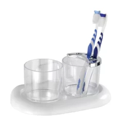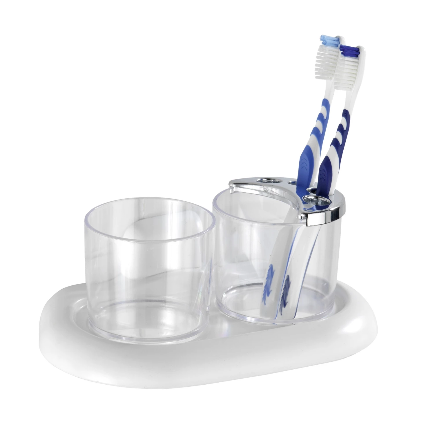 Neben dem Waschbecken bieten die beiden abnehmbaren Becher aus klarem Kunststoff viel Platz für alle Zahnbürsten und Zahnpasta und halten diese stets griffbereit. Das Set besteht aus zwei Zahnputzbechern und einem Zahnbürstenhalteraufsatz für bis zu vier Zahnbürsten.