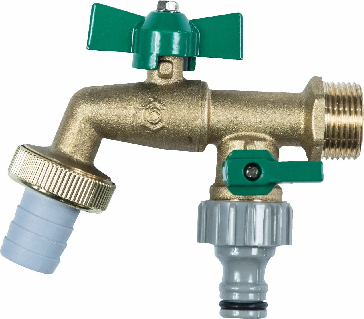 • Inkl. SchlauchverschraubungMessing, Matt, Mit Flügelgriff, Mit zwei separaten Abgängen, Mit Schlauchanschluss für Steckkupplung 3/4″ AG, Inkl. Schlauchverschraubung 1″ IG Tülle Ø 19 mm, Anschlussgewinde 3/4″ AG